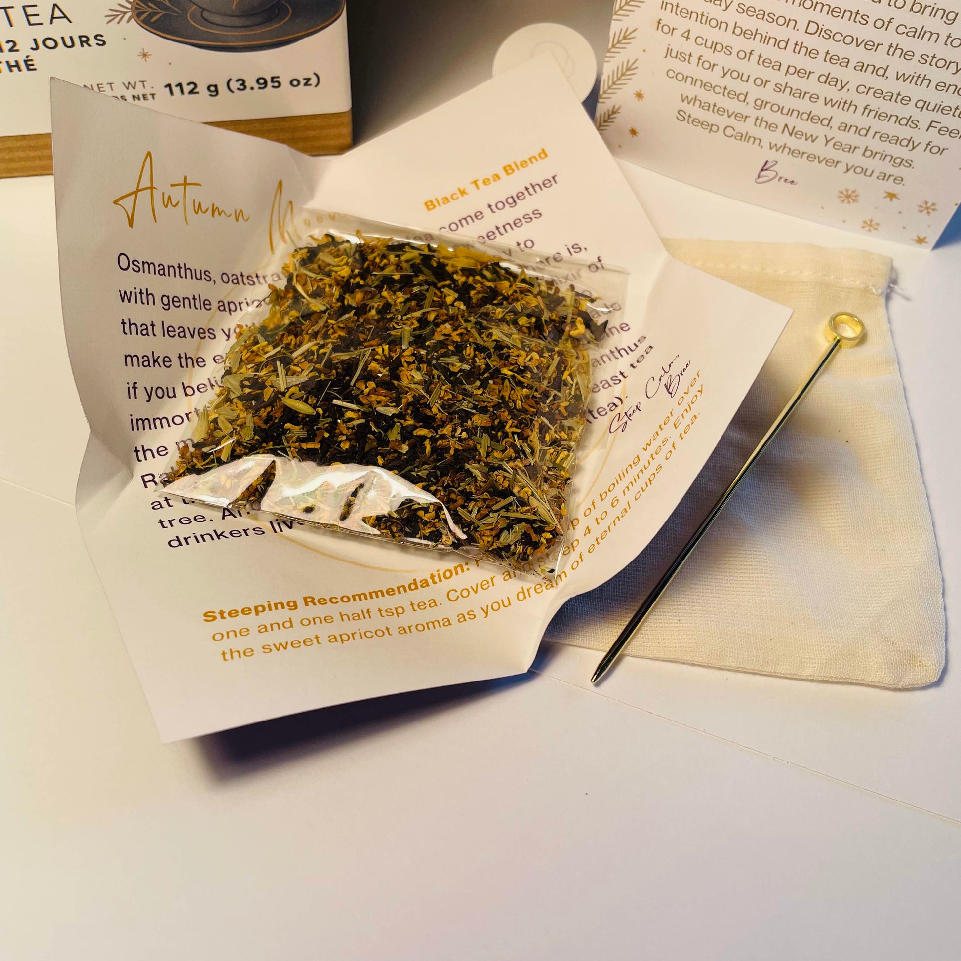 Inside the box find 12 tea presents waiting to be unwrapped. Inside each wrapper you'll learn the story behind the tea. With enough tea each day to make 4 cups, there is plenty to Steep Calm into your holidays and, if you like, to share with someone who could also use a little grounding in the overwhelm of the season. From the tea that started Island Elixir with an afternoon of family connection to the calendar-exclusive Serene Solstice, you will find a beautifully-curated assortment of herbal, green, oolong and black tea blends ready to delight your palate and nourish your soul.